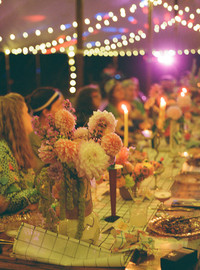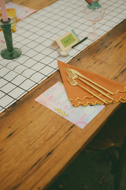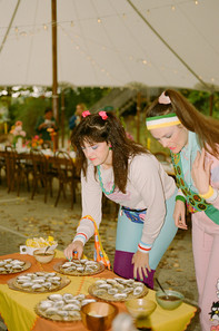 Saturday turned it up with a bitchin’ 80s exercise-themed dinner and dance party. Every detail of the 80s tablescape was thoughtfully curated, with carefully thrifted vases, candlesticks, and candles coming together to create a bold, eclectic setting. The result was a vibrant, retro-inspired atmosphere—perfect for such a lively celebration.